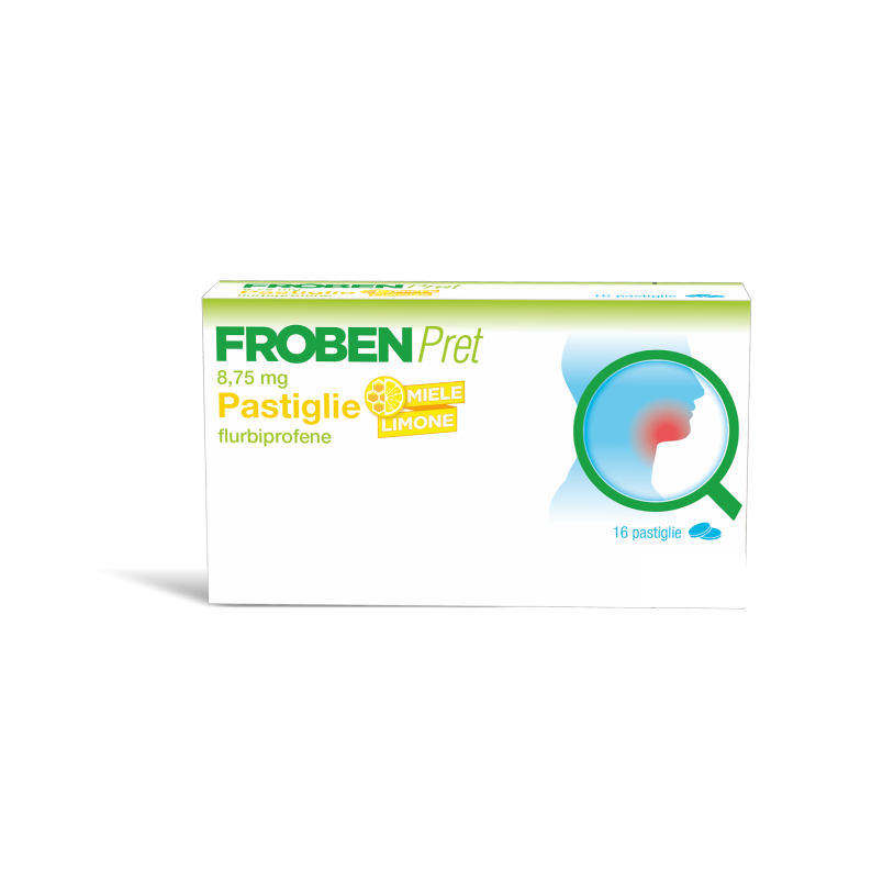 FROBENPRET appartiene a un gruppo di medicinali chiamati farmaci anti-infiammatori non steroidei (FANS), utilizzati per alleviare il dolore e l’infiammazione. Ogni pastiglia, all’aroma di limone e miele, contiene 8,75 mg di flurbiprofene. Questo medicinale è usato per alleviare sintomi del dolore e delle irritazioni delle gengive, della bocca e della gola come: